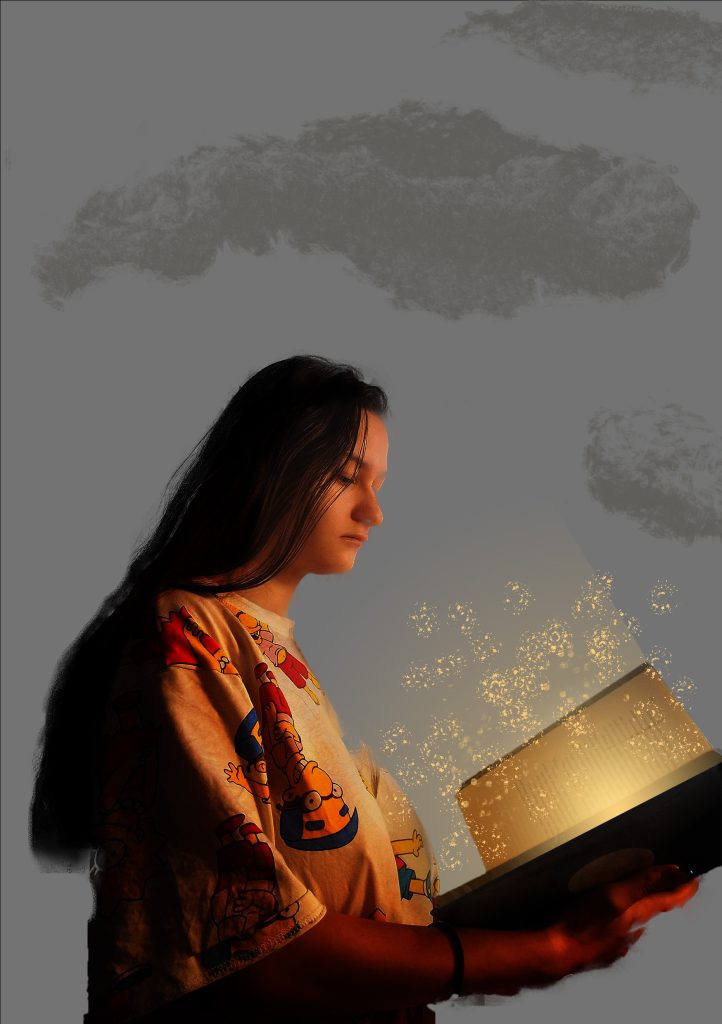 Using clipping mask, brightness adjustment, gradient, and brushes to create a fantasy look that the book is sparkling and illuminating the light onto me to portray the feeling of being transported into a book world. Using the brush effects in photoshop I created my own background using light grey as a starting background and layering darker grey with brush effects to create clouds as a background. As well as using brush effects to create the sparkles coming out the book.