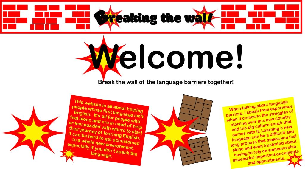 The first page is a welcome page, welcoming the viewers to the website. The welcome is the focal point because it’s the biggest sized text on the page which automatically guides the viewers eyes to it first. The two designs, one is of the explosion to represents destruction and the second one is of breaking the wall which is the whole idea of the project. For the two pieces of text, one explains what the website is about, whereas the other one is about my personal experience to make the viewers know the creator understands the problems from personal struggles.