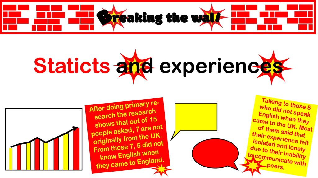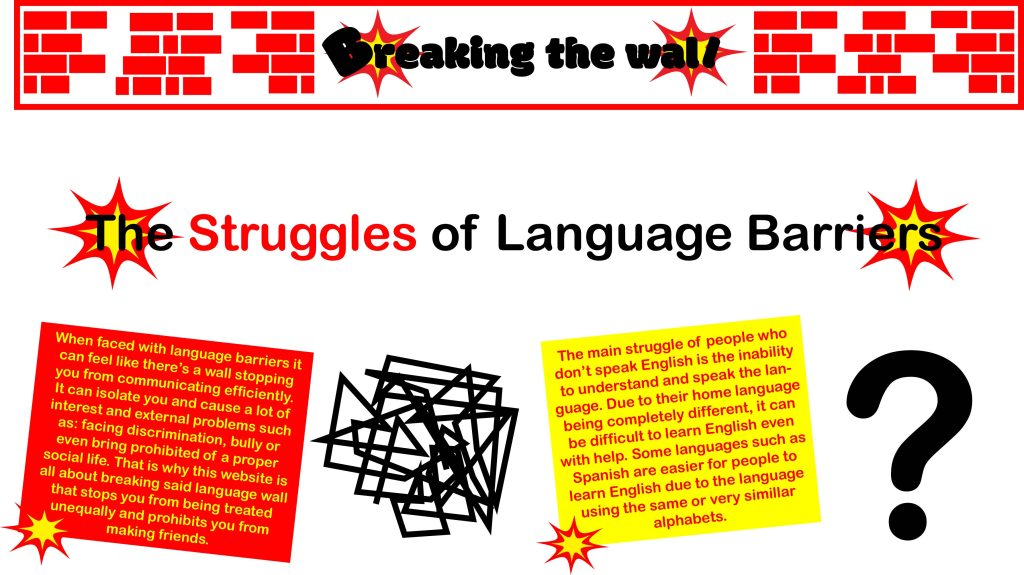 The second page is all about the struggles that language barriers can create. The ‘struggles’ in the subheading is in red to highlight what the page is about and make it very clear for the viewers. For the two designs, one is a question mark to represents the misunderstandings that can occur when people can’t communicate properly. The other design is of scribbles in a shape of a ball to represents the frustrations of not being able to convey what you want to say. The two pieces of text are all about how not being able to communicate affectively can affect people’s social, work and personal life.