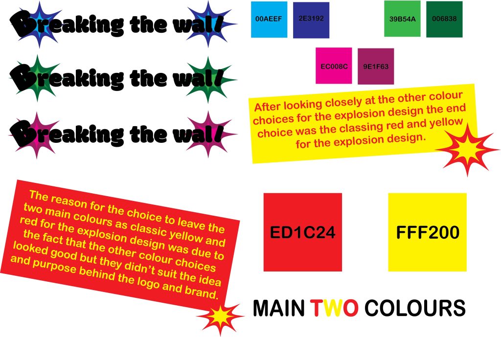 To find the two main colours that will be used in the typographical graphic standards as well as throughout the project I did different colour combinations with the logo such as green, pink, and blue to decide which colours will look the best for the logo and the whole project. However, after looking at the more colourful options, at the end the decision was to keep the colours of the explosions more classic red and yellow. I did not want to use more then two colours for the typographical standards because I did not want to make the pages feel busy by having too many colours going on at the same time. That is why red and yellow and different hues and saturations are used throughout the project.