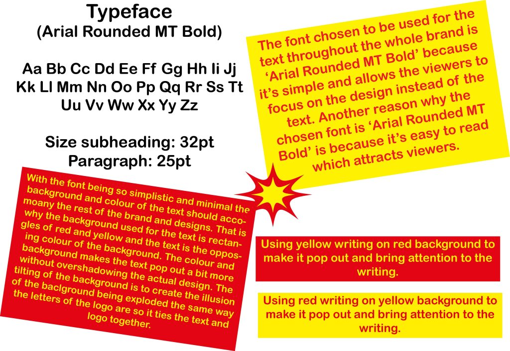 When deciding the font for the typographical graphic standards that will be used throughout the entire project I wanted to go for a simple and minimalistic type of typeface because then the viewers can focus more on the designs and purpose behind the project rather than on the text. The typeface that ended up being chose is ‘Arial Rounded MT Bold’ that is naturally bold as the name suggests. With the fact that the typeface itself is bold means that the text will still be noticed by the viewers, it just wouldn’t be the focal point. Using the colours red and yellow to continue on with the theme of the logo. Since the typeface is rather simple, I have used boxes behind the pieces of text throughout the project to make the text pop out more but not enough for it to be overshadowing the other aspects of the pages.