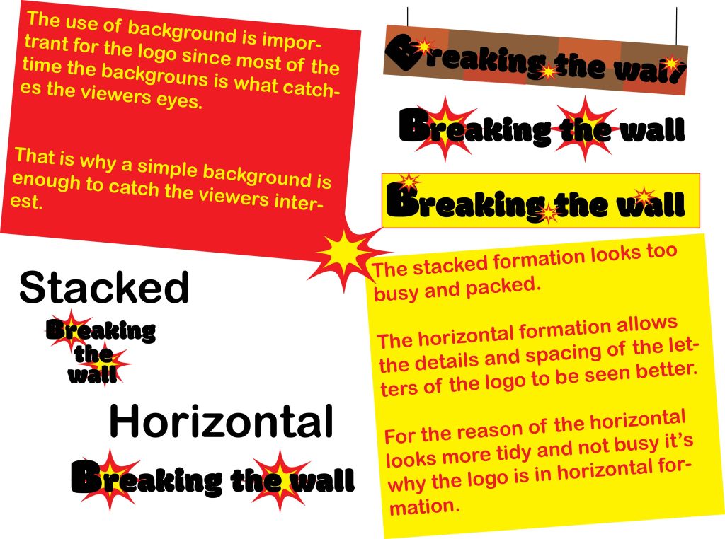 The logo page for the typographical graphic standards is all about how the logo could look like throughout the project. For my logo typographical standard page, I have showed different backgrounds options that have potential to show up in designs and pages later on. The first background is of a brick wall that is hanged by strings, this design is to represent the ‘wall’ in the logo. The second background is of explosions designs that are set at the back of the letters to represent the ‘breaking’ in the logo. The third background is of a yellow box behind the logo which is to bring more attention to the logo and make it more noticeable to the viewers. Then the logo was tried in a stacked and horizontal formation. At the end the horizontal formation was preferred since the stacked one looked too busy from all the different words stacked on top of one another.