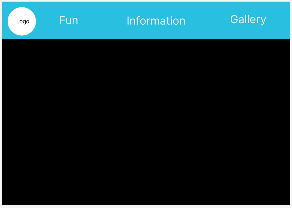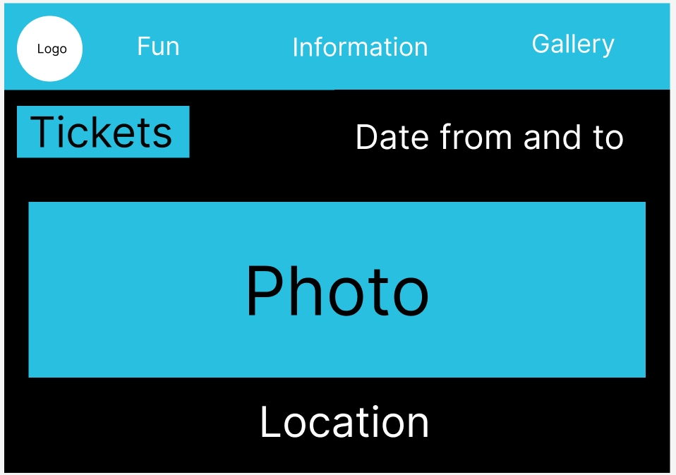 After choosing where the logo will go the next step was to decide how to design the different categories and menus that will go take the users to the desired information. The three different menus are: fun, information and gallery. The reason those three are chosen menus is because they are the most important information the users will be interested in (when looking at different festival websites the main menus that they have used are these.) The background of the menus along with the logo, the whole top of the website is in a different colour to add more contrast to the black background and make the menus and logo more noticeable.