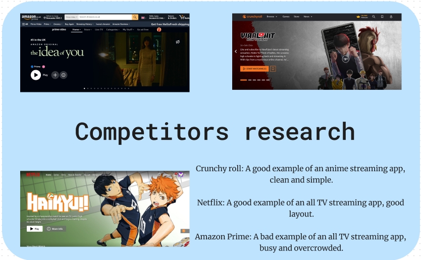 For the competitor research, the companies that were researched were Netflix, Crunchyroll and Prime Video. There are two examples of good layout for a starting page from Netflix and Crunchyroll and one bad example from Prime Video. The reason that the Netflix and Crunchyroll one are good examples is because their starting pages are very clean and simple looking, not too busy with taps and movies. Whereas, Prime is the opposite, with lots of taps at the top that overwhelm the user.