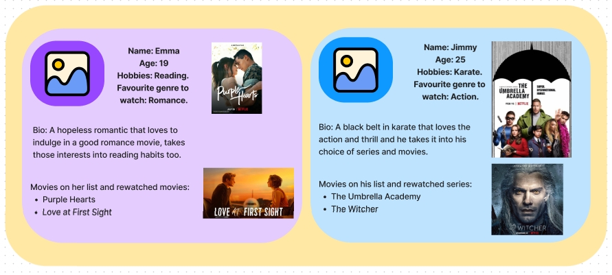 When doing the personas I used friends and family as well as classmates that have a Netflix subscription to gather information and combine it to create the two personas that have age, bio, likes and hobbies. Doing this helps with understanding the audience and what they would like to see on the streaming app.