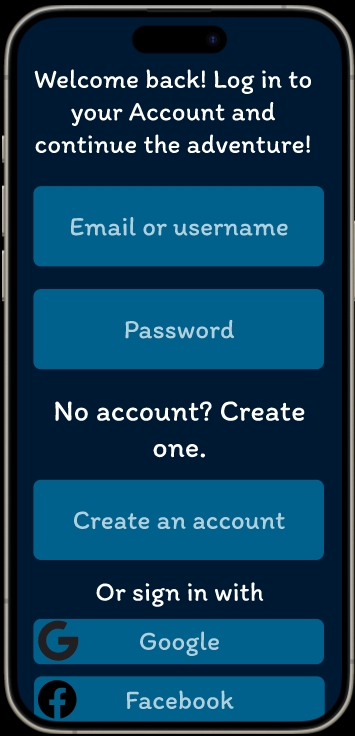 When the users click onto the circle, the next page to appear is the log in screen that will ask the users to enter their email and password or create an account. The background is in the darkest blue of the colour pallet chosen so that it creates contrast with the lighter blue in the front and with the white text, making the text pop our more and bring the attention to the text.