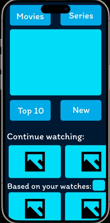 When logged in the user sees the main landing page, this page has four categories the user can choose from, with a photo of a trending movie/series in the centre. Underneath is a continue to watch and based on your watches recommendations that is the two most important things to add based on competitors research and questions answered from classmates and friends. The user can click whichever of all the categories and the blue box next to the based watches that will take the users to different pages.