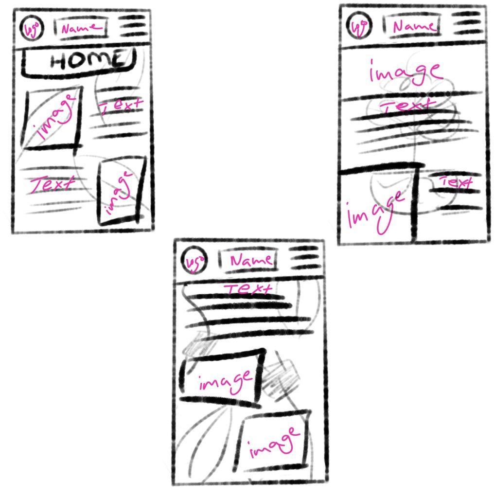 For the wireframe prototyping I chose the app design, using the iPhone 14 protype in Figma (390×844) as the screen dimensions. To start it off I used Procreate once again to draw the sketches, since there will be two examples of the prototypes there are three sketches to give me some choices, all three sketches try out different compositions and background pattern but the logo position along with the name of the company and hamburger menu all stay the same.