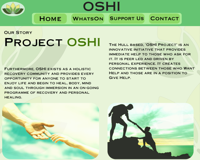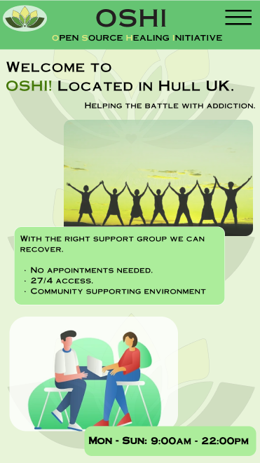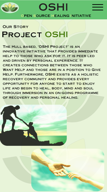 Moving onto the iPad screen, the home page follows the same composition and layout as the desktop one, with two images, a welcome title and text in the bubble that overlaps with the image. However, due to the iPad being larger in both width and height there was too much white space left on the page that made it feel empty, because of that the extra ‘work together to rebuild lives’ text bubble at the bottom above the hours and days was added so that it helps not only fill the white space but also to remind users of what OSHI is striding to achieve with their campaign to help rebuild people’s lives, the ‘rebuild’ part of the text being highlighted in green to further emphases that point across.