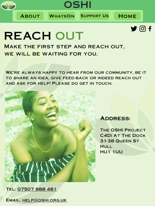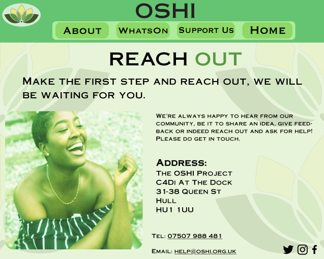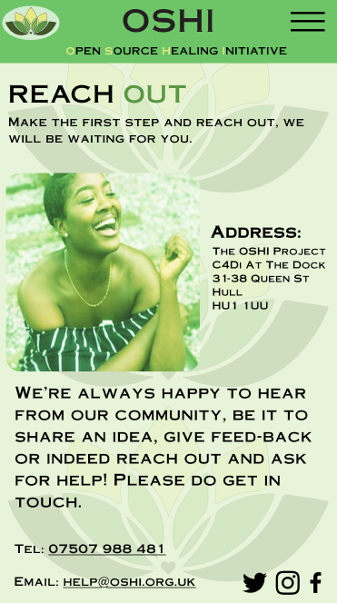 The final page is to help users ‘contact’ OSHI, with the same idea of highlighting a part of the title in green to help it stand out but this time there is no OSHI but instead the ‘out’ is highlighted in green to help encourage users to seek help if they decide to. For this page I have taken OSHI’s address from their website and have made the text for it big and bold so that it stands out even more, with their telephone number and email address below, the users can press on the email, and it will send them to OSHI’s email to get their desired help. This layout is not in the mid-fidelity, but the composition helps the page look tidier without being busy or overwhelming for the users.