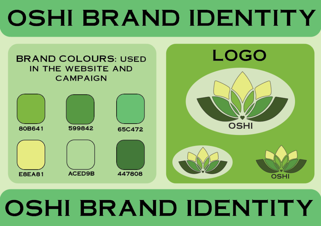 The brand identity guidelines are used to help guide the team through the brand colours and logo. To create the guidelines, I have used the colours previously used in the website that help build the visual aspect of the website and campaign. Throughout the whole campaign and website these colours are used to create a consistent and recognizable visual impact, said colours are in a rectangular shape with the name of each of the colours below it to make it easier to find the needed colour. Next to the brand colours there are three variations of the OSHI logo, throughout the whole website and campaign these three variations can be seen used, the main one being the one with no typography and with white circle as the background to help the logo pop out more against the green background. With these brand guidelines the OSHI colour scheme and style of typography, ‘Copperplate’, has been kept to once again create continuity.