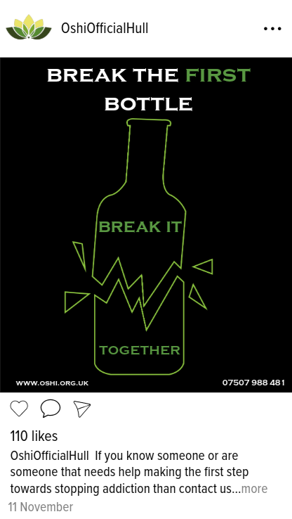 To start with the Instagram post I looked at how Instagram does their layouts (1), to help me with placing of information and choose the font of the typography. Below the likes of the post there is a little description of what the actual post is about as well as the date. For the actual post I used Adobe Illustrator to create an outline of a broken bottle and shards using the pen tool, then exported it and imported it in Adobe Express, adding the typography using once again the signature font ‘Copperplate’, using the brand colours to change the outline and some of the words to continue the consistency of using the brand colours throughout even the social media aspect of the campaign. This post focuses on breaking the bad habits of addiction to alcohol. Adding typography to the inside of the broken bottle helps guide the users’ eyes to the message of the whole post, the bold white text at the top helps creates a contrast against the black background. Not wanting to overwhelm the users’ eyes with too much text is the reason the text inside the bottle is in the same colours as the outline of the bottle. Furthermore, the word ‘first’ is in green to help bring attention to the message behind it.