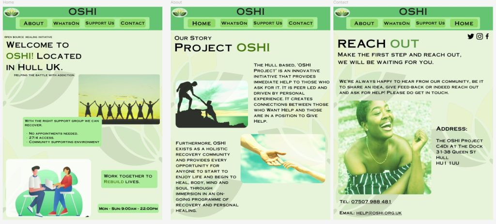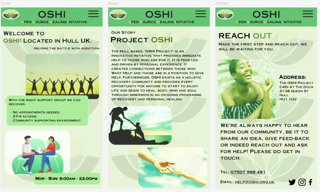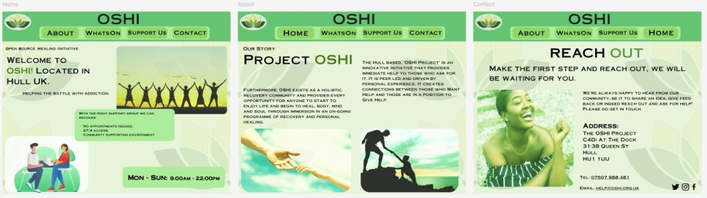 With the Mobile version its different since the header for this version does not have the buttons in it which means that for this version there had to be a hamburger menu made that will pop down for the users when it’s clicked an it will showcases the buttons that way. This has allowed me to use the full name of OSHI – ‘Open Source Healing Initiative’ under the OSHI name in the header instead of the buttons and this is the only version that has that due to that free space in the header, highlighting the first words to form OSHI.