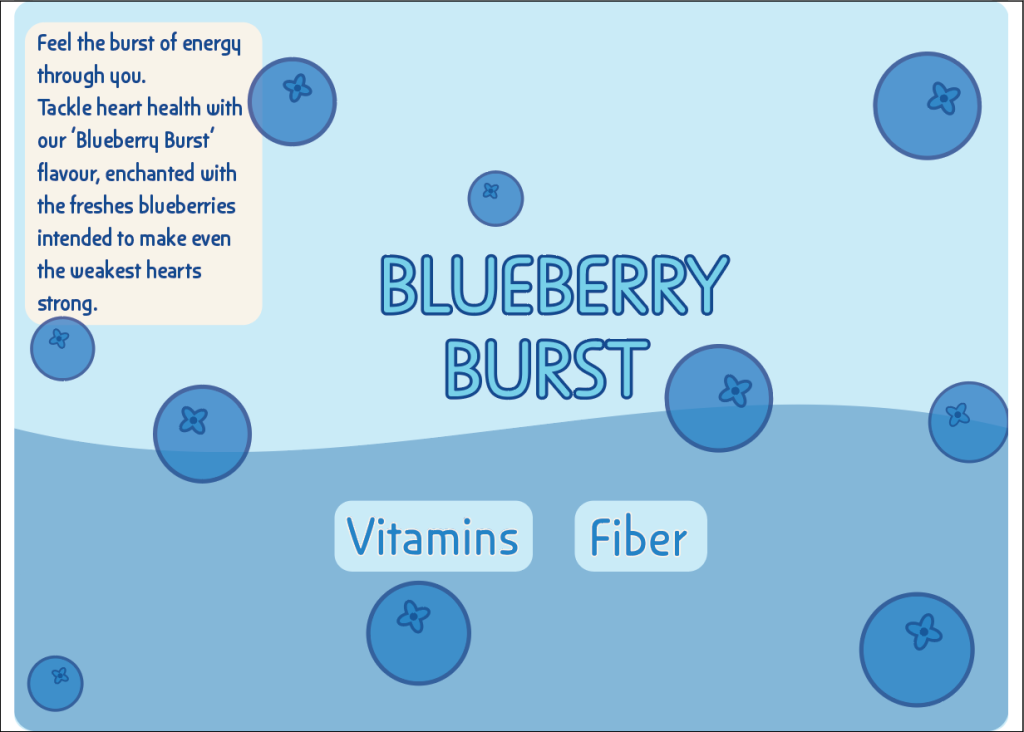 This is the final label for both the blueberry and orange flavour, made using Adobe Illustrator and the previous research discussed in this post. Darker colours used for the outline of the names so that it makes it pop out more for elderly who might have bad eye sight.