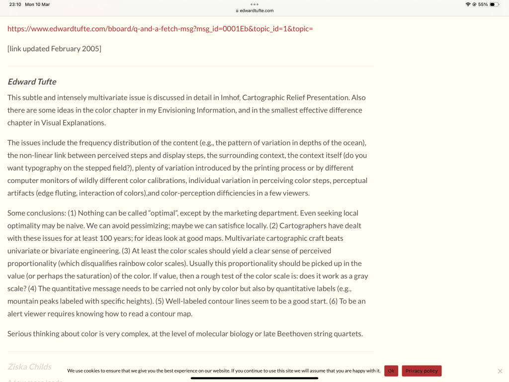 When looking into Tufte’s prospective of using color, he mentions in a reply to a post (1) that when dealing with using colors that are differentiable from one another and making sure that viewers can still tell the colors apart the designer should ask themselves ‘does it work as a gray scale?’ In an article (2) it’s talked about how Tufte talks about using colors with good ideas, using them sparingly. With this in mind I plan to use one colour (shades of blue) but in different shades and hues in my label design instead of 5 different colours (blue, pink, etc.) to create simplicity for the viewers.
