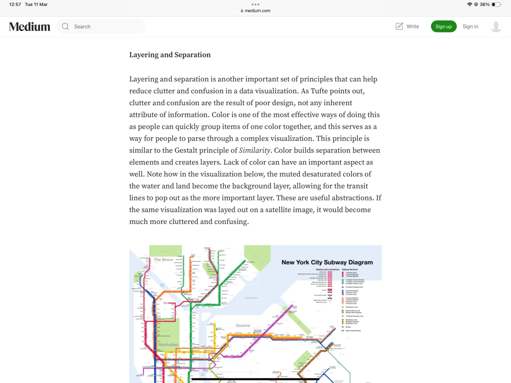 For the layering and separation part of Tufte’s theory, this article (5) uses Tufte’s theory to explain that layering and separation is an important principle to consider when doing design work. By layering and separating pieces of information, it helps reduce ‘clutter and confusion’ and make it easier for consumers to understand the piece of work without getting confused. An effective way of making layers and separation is by using colour. Due to the human eye grouping colours together, this helps with simplifying a complex design.