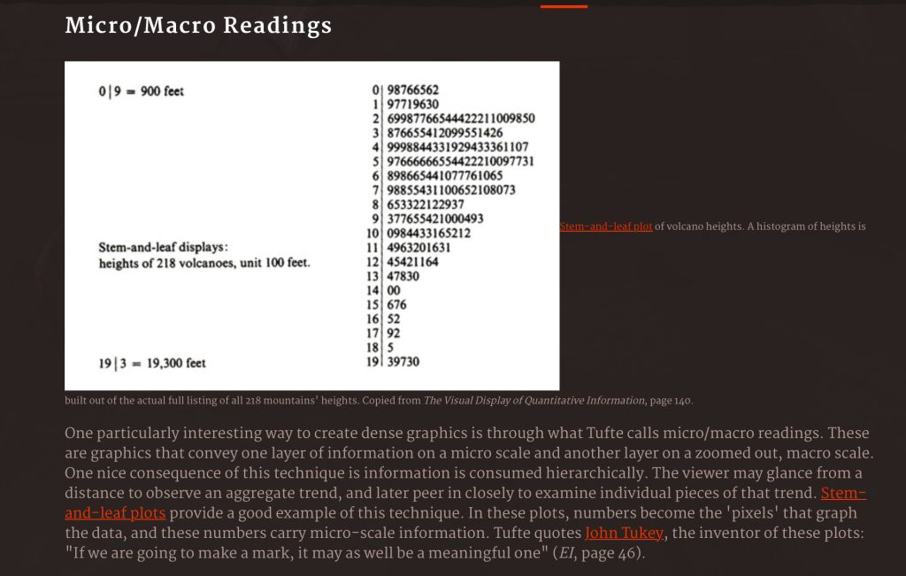 The final theory of Tufte’s that I hope to incorporate in my work is Tufte’s theory of micro/macro readings. Using an article (6) that explains Tufte’s theory of micro/macro as ‘graphics that convey one layer of information on a micro scale and another layer on a zoomed out, macro scale.’ This could be used in my work by changing the position of the camera to show a macro scale of the scenes. Going from micro to macro that way.