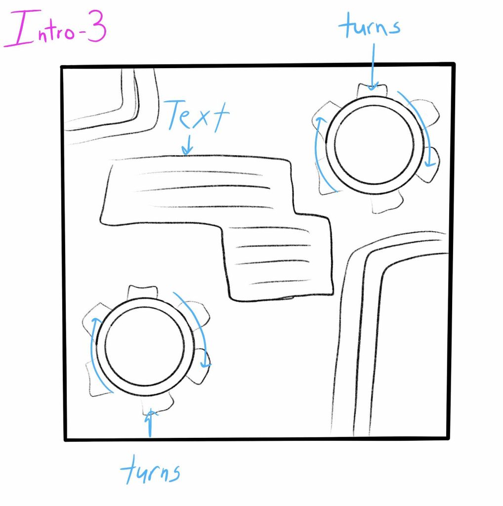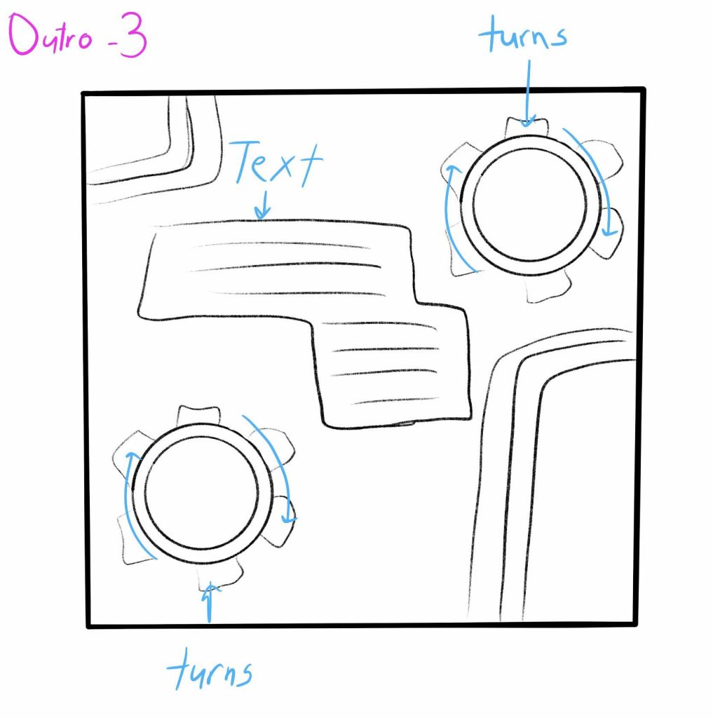 After doing the rough storyboard sketches, I went back and did all of them on separate layers where more thought and thinking was done about the placement and how exactly it will look in Animate. This detailed storyboard has writing that explains what part of the scene will be animated, like the intro and outro, the gears will be turning along with the coming in. These more thought-out sketches help me think more about the actual animation part. With the black circles that will have their opacity changing, there will be statistics or facts written in them to help the viewers understand the severity of AI being used in creative fields. These statistics/facts are taken from these two articles (1 & 2) that talk about how quickly Ai has been implemented in the industry.
