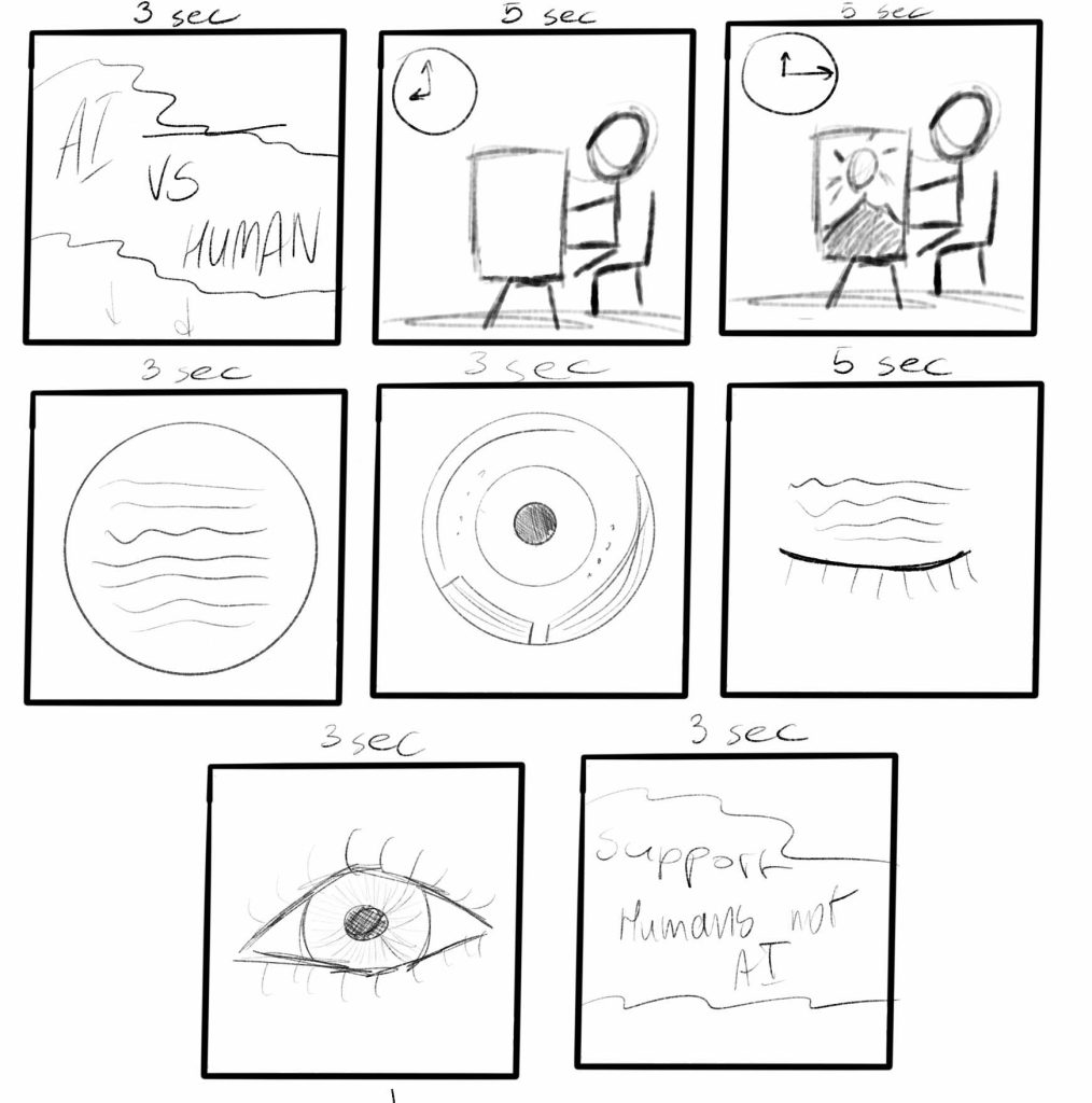 When starting to visualize the way the animation will go the first thing that was done were the rough sketches for the storyboard. For this storyboard 8 panels were used, the first sketches are quite rough without much detail or explanation in them just to quickly visualize the order that the animation will go in. For the first and last 3 seconds of the animation I knew that an outro and intro will be needed to hopefully give the viewers an introduction of the topic that the animation is about. From later sketches the phrase that is used in the intro is ‘Ai taking over Human jobs.’ The intro is short and straightforward, with the first word being ‘AI’ it makes it immediately clear what the animation is about. With the outro the same visual will be used but the phrase will be different, and it will reflect my opinion on AI that will also be portrayed throughout the animation and different scenes. All the visuals such as the human, canvas, clock, robot eyes, human eye etc. Will be done in Adobe Illustrator and imported into Adobe Animate so that the visuals are more precises with the available tools in Illustrator such as the pen tool. When doing the storyboard, one box is going to be one scene in Adobe Animate, so in total there should be 8 different scenes that change within the time to create the animation and transitions.
