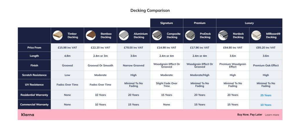 3 – Cladco Decking (2004.) Decking Comparison. Available at: Garden Decking | Timber, Composite, PVC & Bamboo | Cladco [Accessed 05 May 2025]