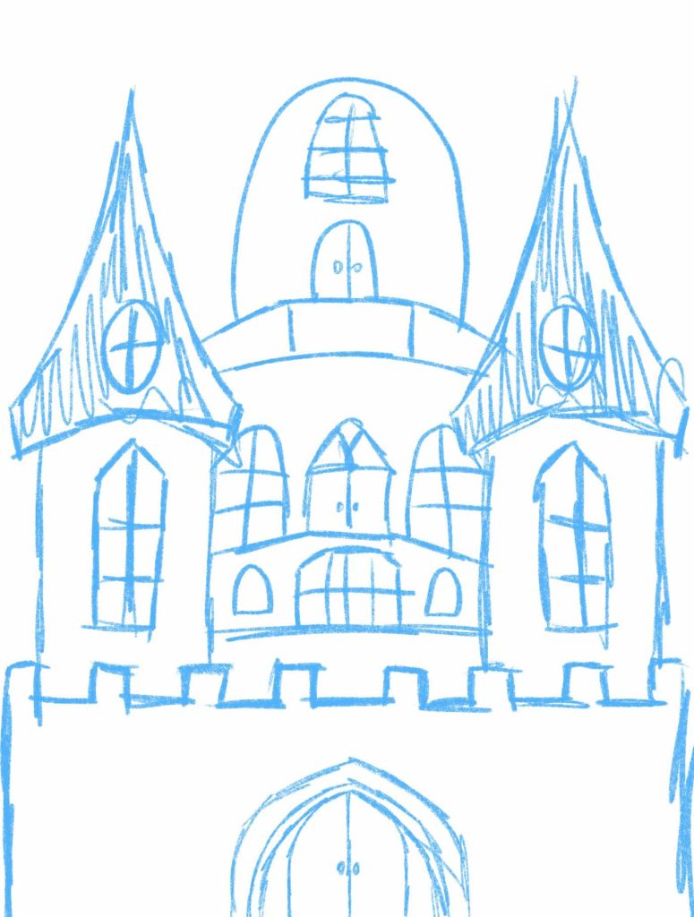 These are some of the sketches that once again used the references as inspiration for how the outside of the castle will look since that will be the main part in the 2D animation. The focal point of the animation that the viewers eyes will go to. Next to the sketches is the outcome with the outline and colour added, before it’s imported into Animate.
