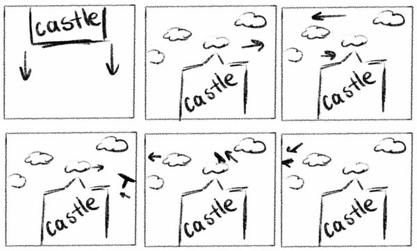 After finishing with the design of the castle, I then imported into animate and then made sketches of the idea that I wanted for the animation with arrows pointing and giving me an idea of how I wanted the clouds and bird to animate and move, as well as how the castle will come into view using the camera setting to bring it into view from above and the clouds coming in from the left whereas, the bird coming in from the right.