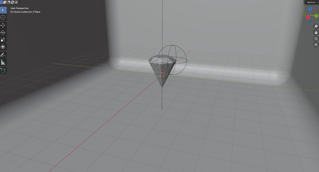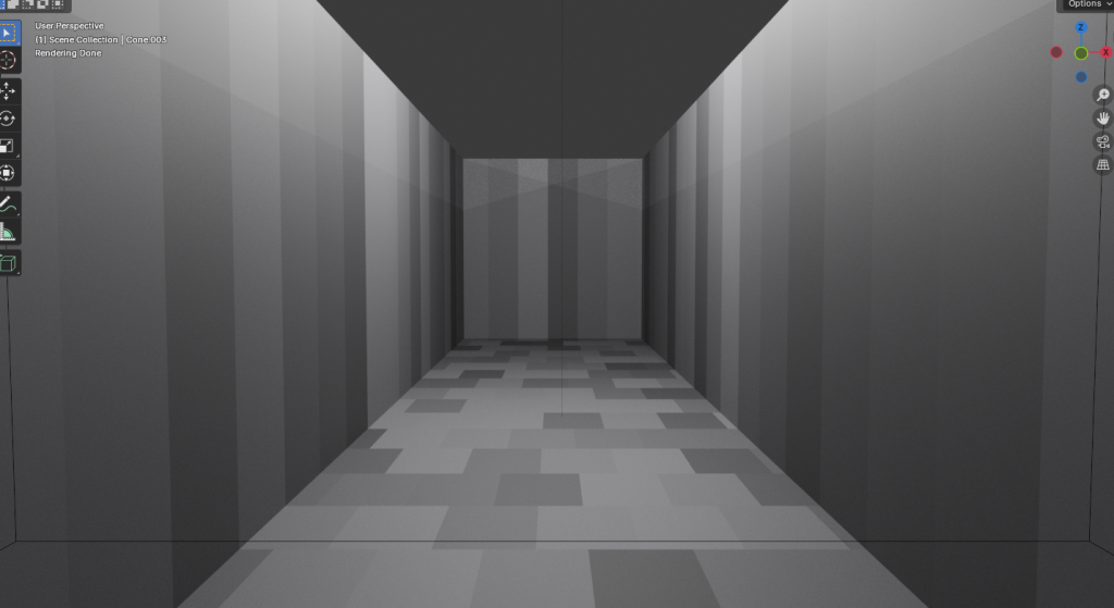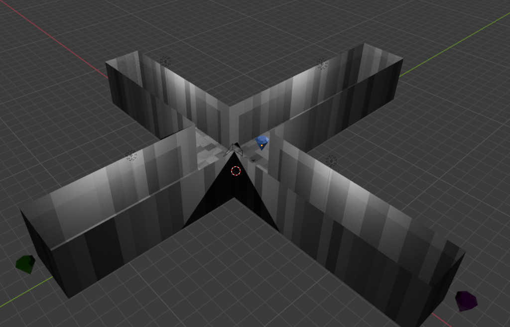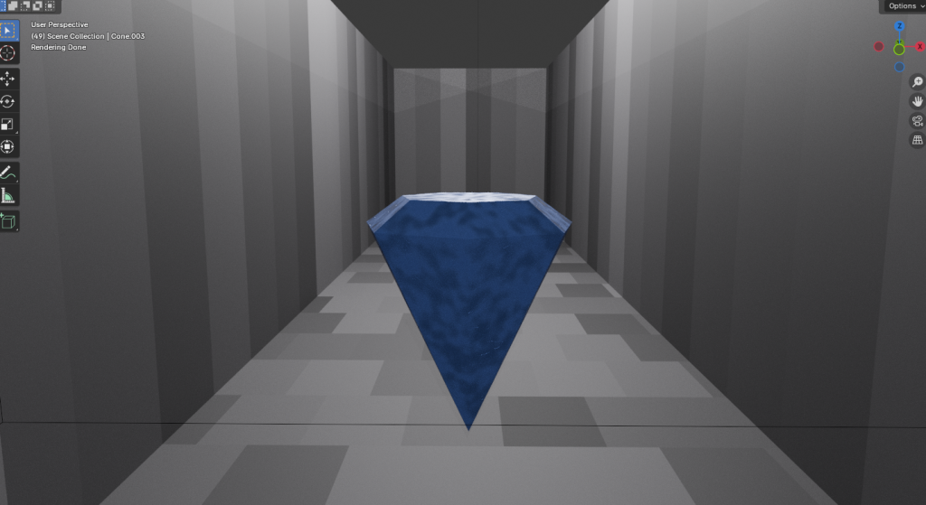 For the 360 render I used Blender due to being more familiar with it and feeling more comfortable to model a scene around the camera. When thinking about the kind of scene I wanted to create, I wanted to focus on bringing the viewer attention to an object that would guide them in different directions. For that I created a hallway like model with four long forward paths, this way the viewer only has so much space to turn around in which also helps with making sure for someone that gets motion sick, using walls to guide them to stay in place. For the object the final decision was a simple diamond shape, not wanting to go too complex since the object would move quickly away from the viewer and they would not have time to look at any details, a simple diamond will be easy and fast to see and not overwhelm or get the viewers motion sick.