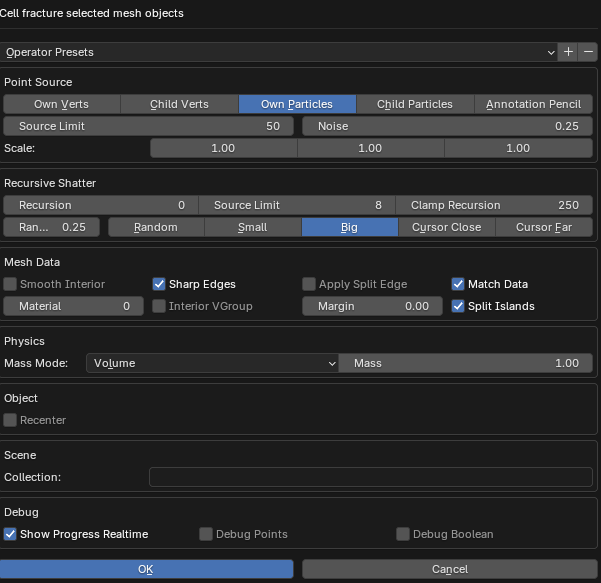 Furthermore, to continue to explore different Blender mesh and possibilities I also created a shattering animation, using the shattering tutorial, with the add-on cell fracture to make the object shatter, I wanted to explore different ideas by experimenting with the settings in the cell fracture, making the pieces the object separates into bigger, smaller, medium to see how different the final animation would look with different settings than the tutorial. After some experimentation these are the final settings that were used for the final animation: