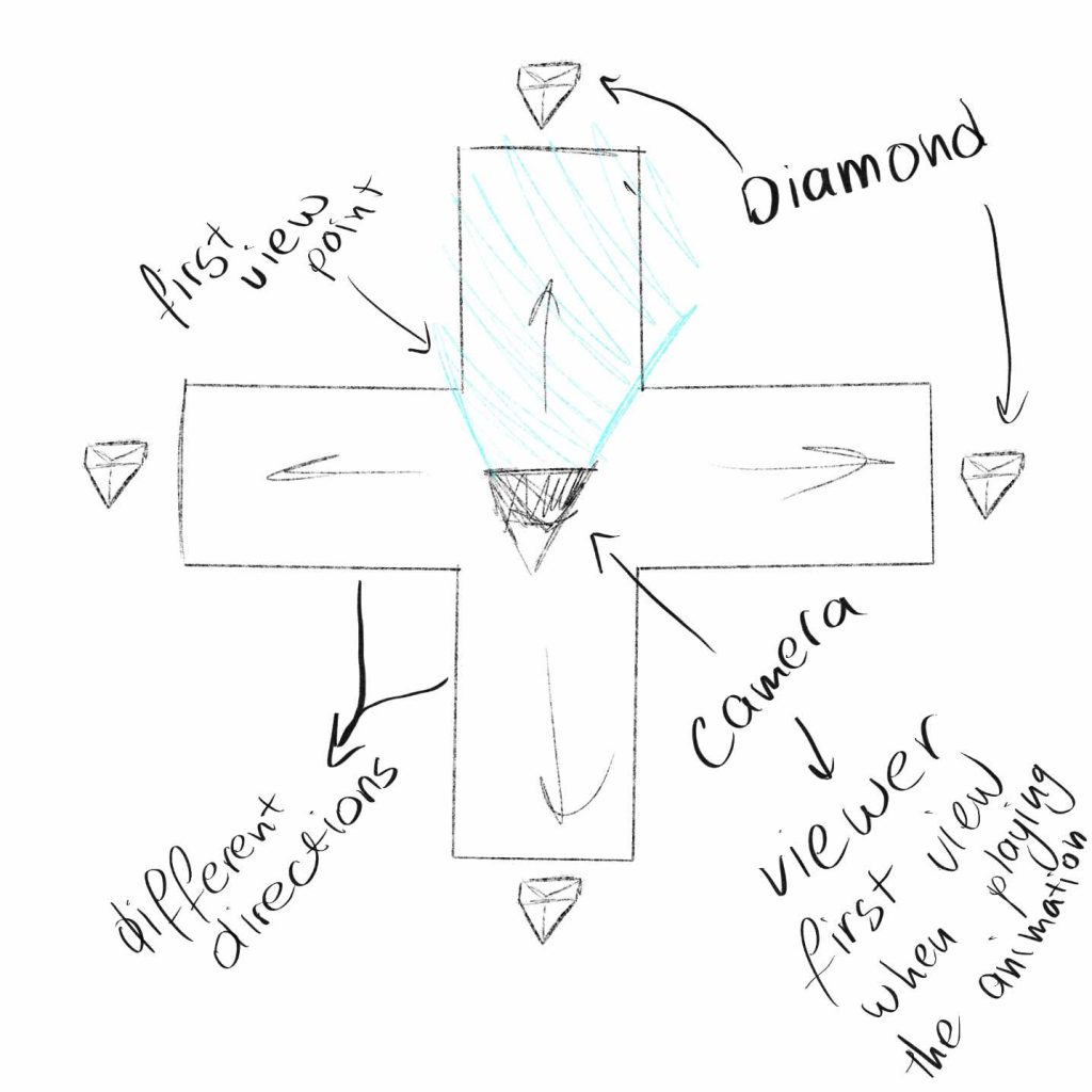 The final 360 idea is for the diamond to come from the wall, making sure the camera view is facing that wall so that the viewers get guided from the start to prevent confusion and immediate disinterest if nothing was to happen.
