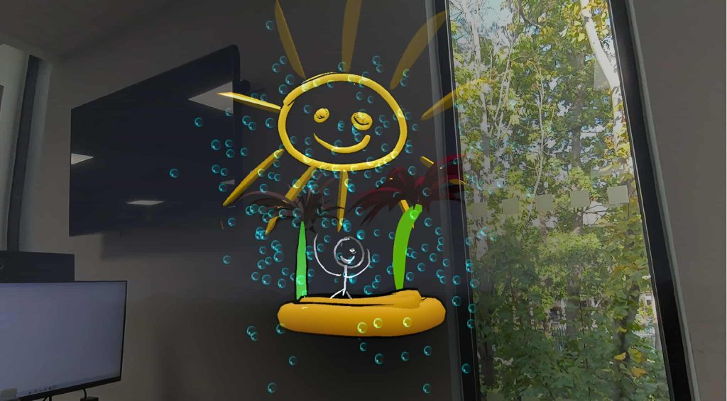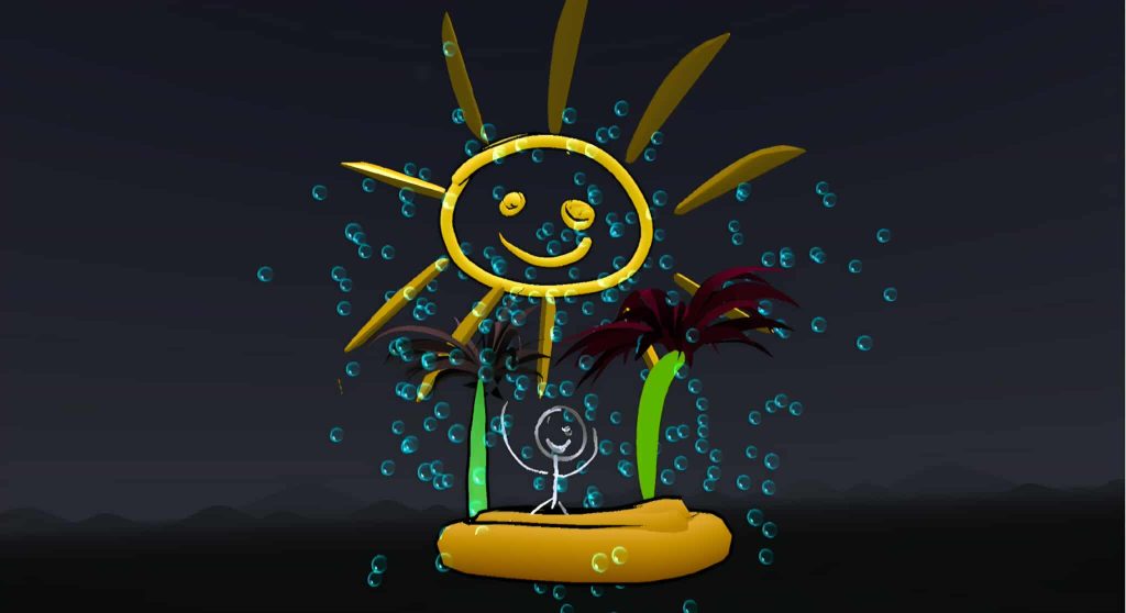 However, the second time when using he headset I made sure to adjust it to fit my glasses to help me see my surrounding inside open brush better. After using the headset for five minutes I gave drawing something a go, with open brush having so many varieties of brushes, a good chunk of time was spend experimenting with them. After getting used to the brushes I went with a simple drawing of a stick figure on a beach, using the leaves and bubbles brushes to make it look more tropical and using the icing brush to make the sun and sand to add different textures to the drawing.