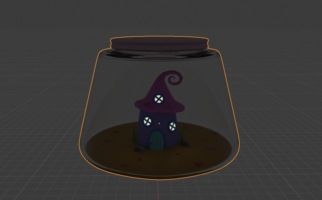 (Screenshots of the modelled house/globe scene in blender, mainly the jar with and without texture and the house inside of it.)