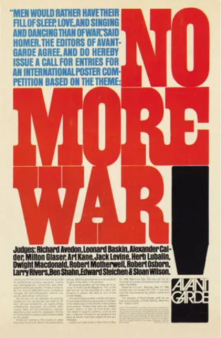 When looking at graphic design examples in the post war period, one stands out and that is ‘Avant Garde magazine’s anti-war poster contest’ designed by Herb Lubalin in 1968. The poster has strong use of colour theory to bring the viewers eyes to the message the designer is trying to portray which in this case is to not create anymore wars. The scale and colour of the words ‘no more war’ make them the focal point that the viewers eyes immediately focus on. Alongside that there is a paragraph in blue that talks about a quote that says how men would rather stay home then go to war. The contrast between the urgent red and the calm/electric blue creates a hierarchy where the first thing the viewers see is the red text then the blue. Alongside using colours to catch the viewers’ attention the designer has also used icons/signals such as the exclamation mark in black. The exclamation mark creates a sense of urgency and importance to the piece that makes it feel more important. Finally, the font that is used reminds me of the font ‘impact’, with a font that is so bold and has volume it makes it feel like there is importance to the words, if the designer used a more Serif like font the feel and message wouldn’t be perceived as urgent. Overall, this example showcases how colour and typography alone can create a cohesive piece of work that can portray the designers’ thoughts and feelings about a certain topic (in this case war) perfectly.